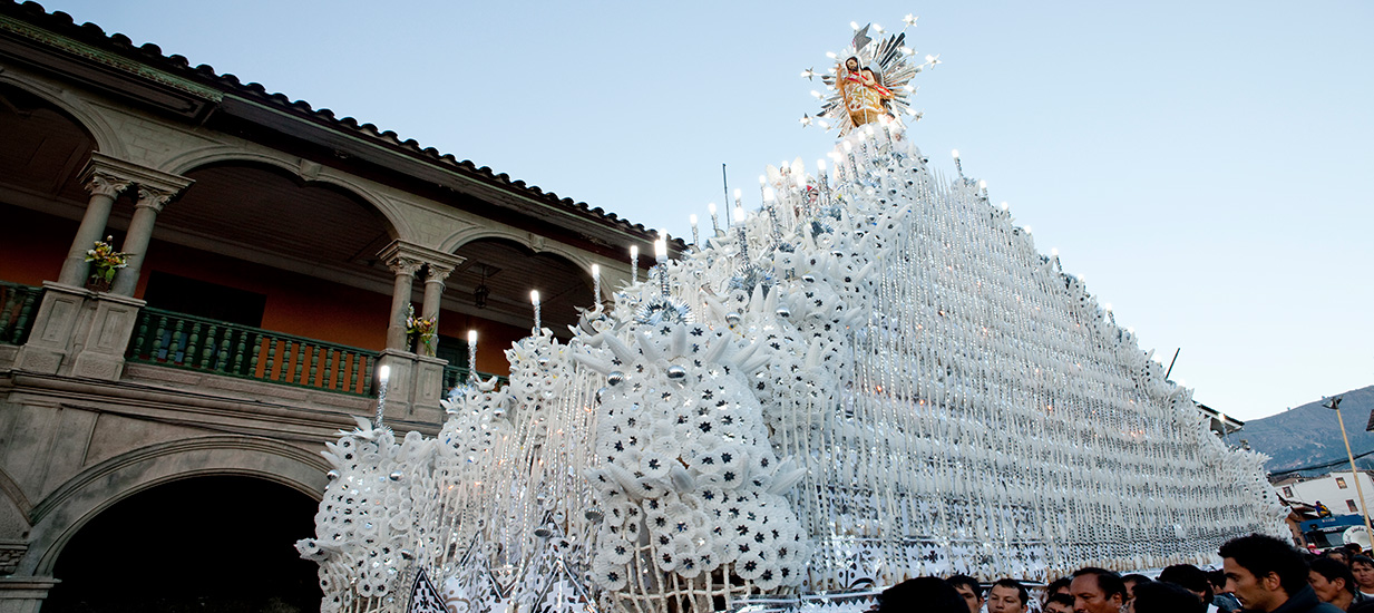 Madera, telas, flores y velas de cera (Parafina) se integraron con precisión para dar forma a una pieza única que recorre las calles de Huamanga durante las celebraciones de Semana Santa. Para cargar el anda se necesitan alrededor de 400 personas.